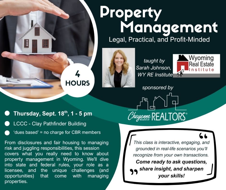 9/3: Leveraging My Association Membership to improve My Business 3 hours of CE credits, taught by Wyoming REALTORS® President, Annie Wedgewood.