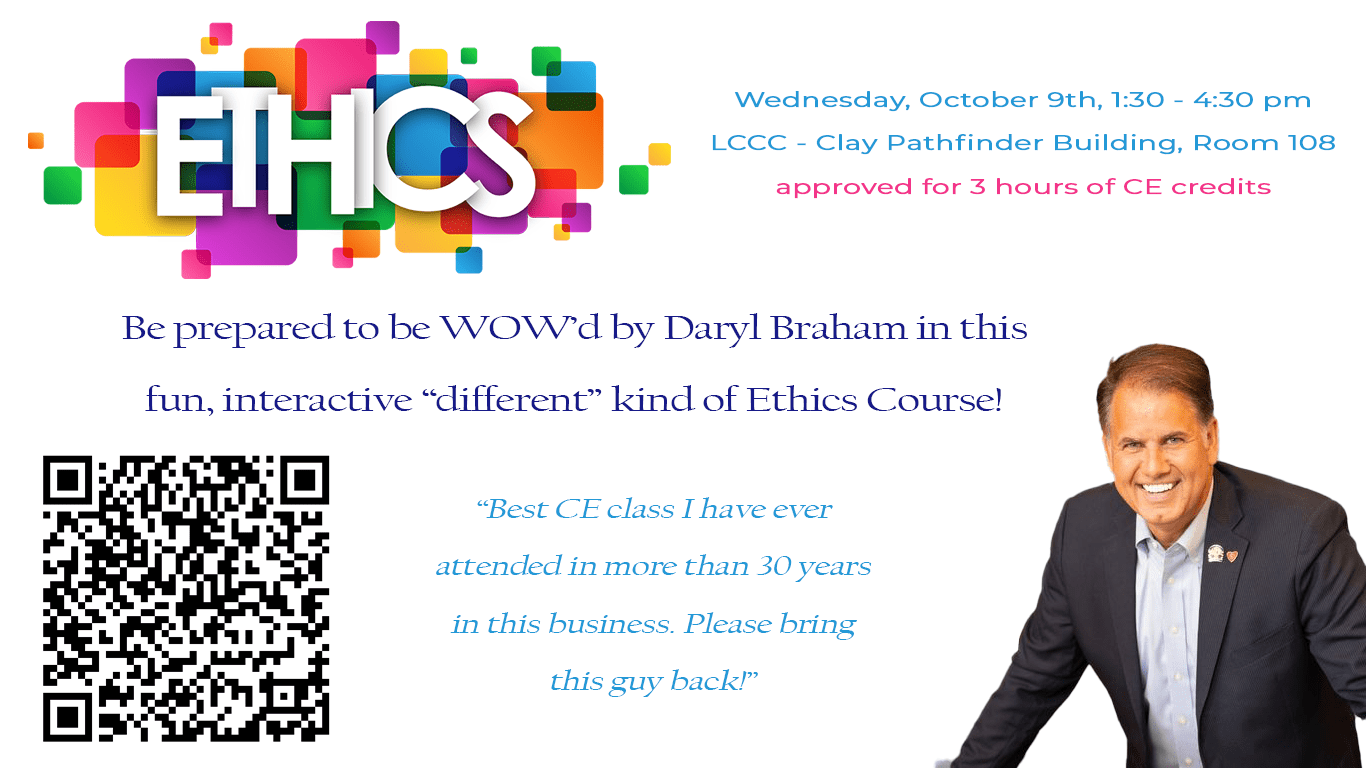 Attend this 3-hour Code of Ethics course taught by Daryl Braham to satisfy the NAR Code of Ethics requirement AND earn 3 hours of CE credits!Images